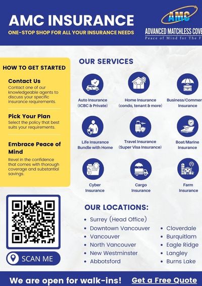 AMC Insurance is a trusted insurance brokerage serving the BC Lower Mainland with 11 convenient locations. We provide a full range of insurance solutions including home, auto, commercial, condo, tenant, motorcycle, travel, business, life, marine, boat, and contractor coverage. Our experienced agents are available seven days a week, from 9:00 AM to 9:00 PM, to ensure you receive personalized service and expert advice. We work with multiple reputable insurers to compare quotes and secure the most competitive rates for our clients.